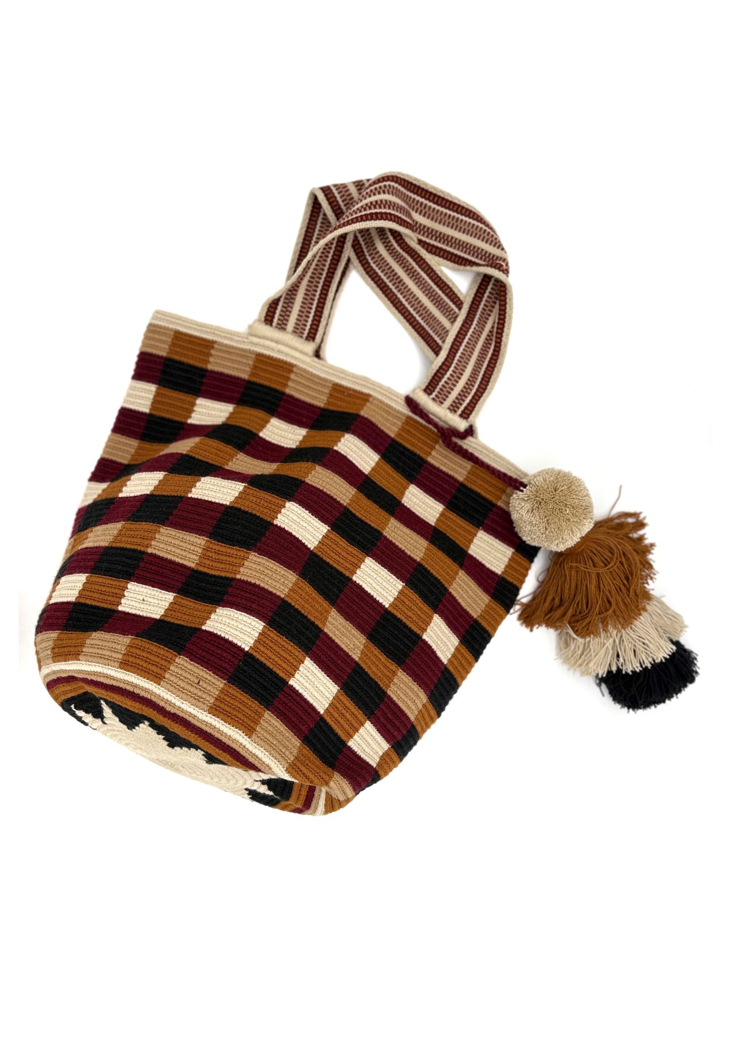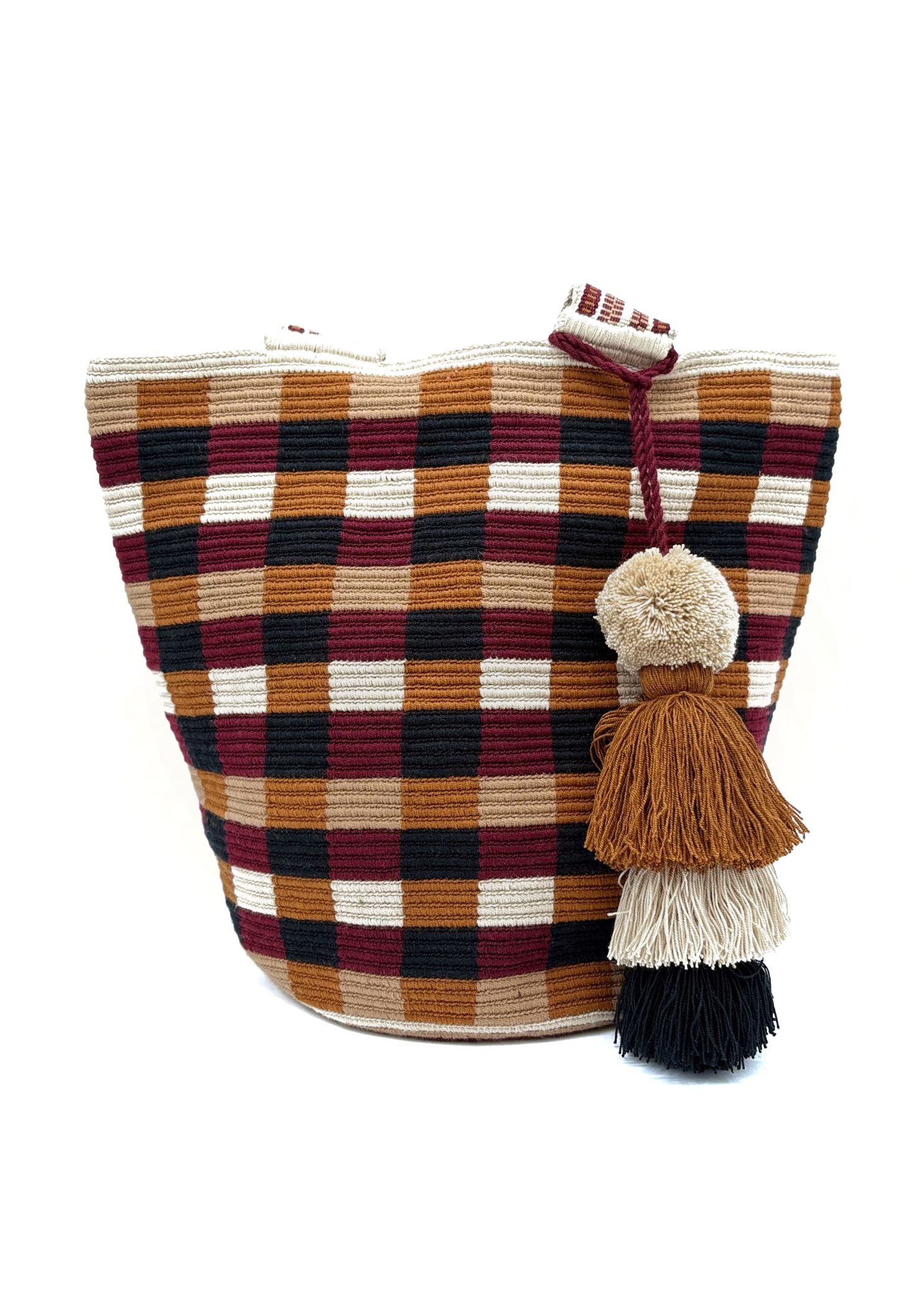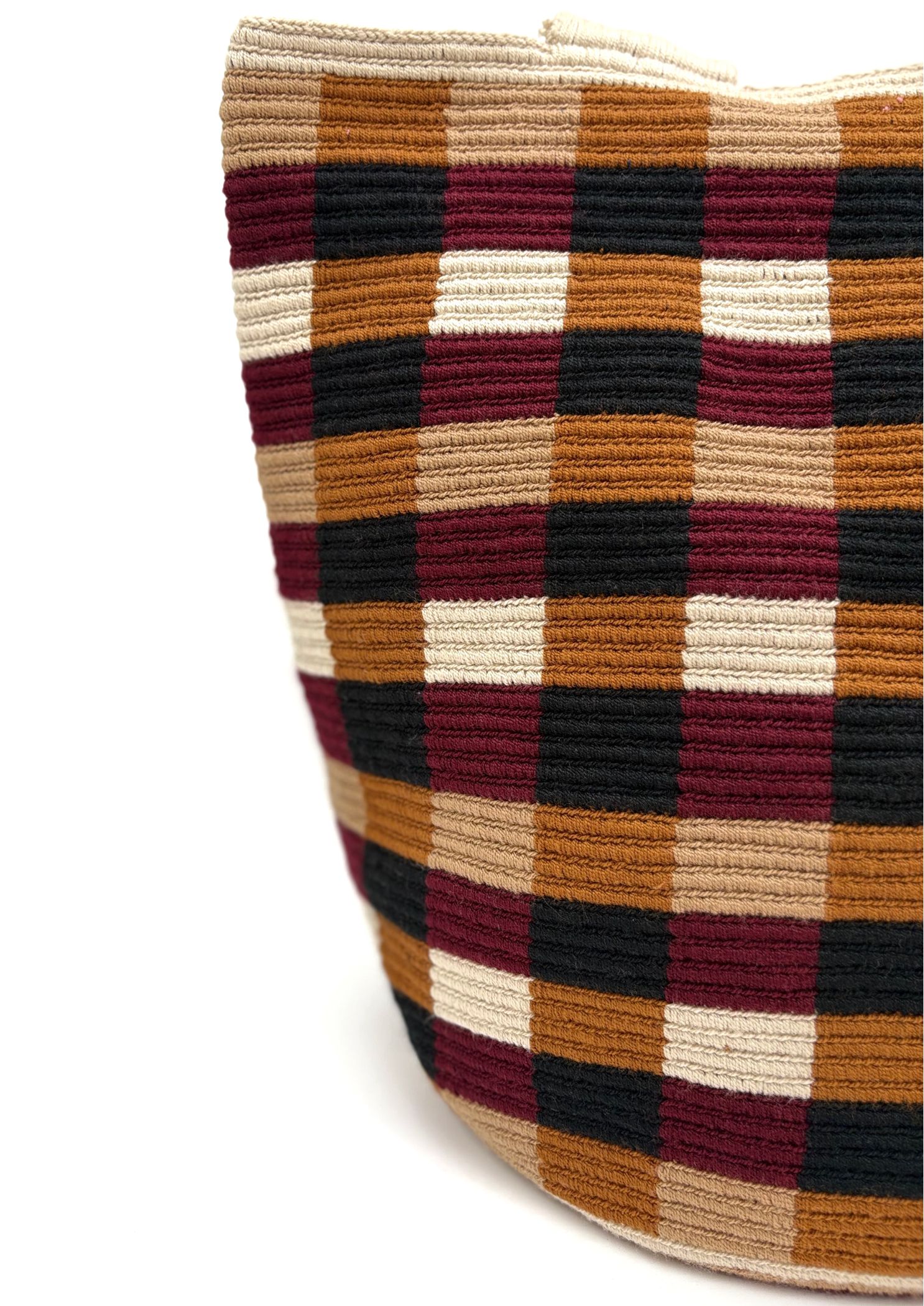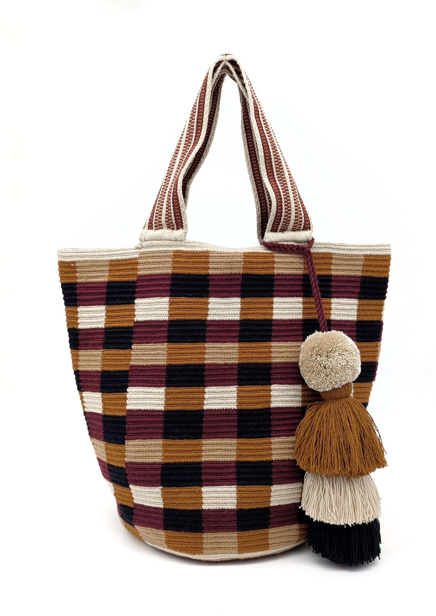 What makes the Vichy tote truly remarkable is its color palette and texture. The bag’s pattern features a tapestry of interwoven lines in warm, earthy tones wine red, terracotta, sandy beige, and soft brown resembling the ancient looms used by Wayuu weavers. These hues are inspired by the natural landscape of the desert coast, where sunsets paint the sky in these very shades. The resulting design is bold yet grounded, traditional yet modern.